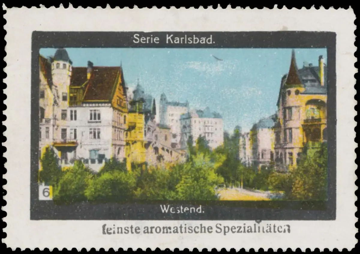 Serie Karlsbad, 6, Mikado Tee-Melangen feinste aromatische Spezialitäten, Größe/Zustand: 5x7 , guter Zustand, Original alte Reklamemarke die seinerzeit für die Werbung benutzt wurde