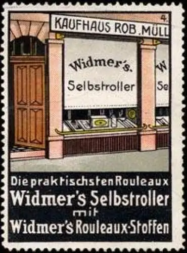 Die praktischen Rouleaux mit Widmers Rouleaux - Stoffen. Nr. 4, Größe/Zustand: 6x4 , guter Zustand, Original alte Reklamemarke die seinerzeit für die Werbung benutzt wurde