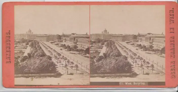 Bemerkungen: Aus dem Studio Oscar Kramer, Wien Kohlmarkt - Zu sehen sind das Parlament (heute Karl-Renner-Ring), das 1883 eingeweiht worden war, das Naturhistorische Museum. Der Pallas-Athene-Brunnen vor dem Parlamentsgebäude fehlt noch. Dieser wurde erst 1902 fertiggestellt. Die Straßenbahn wird noch von Pferden gezogen. Die letzte Pferdetramway fuhr in Wien am 26. Juni 1903. Die Alleebäume am Ring sind frisch gesetzt. Falsche Beschriftung a. d. Karton: Laxenburg.