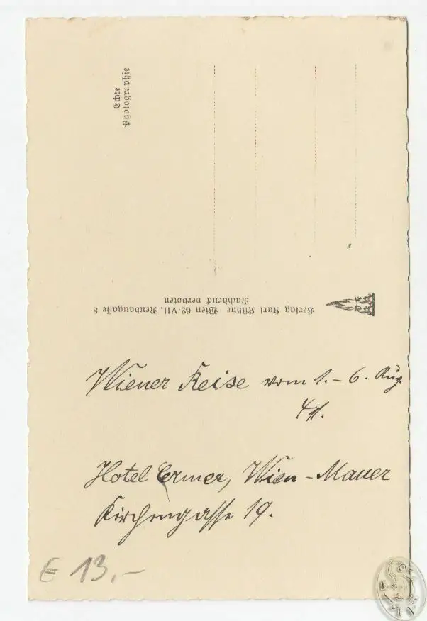 Wien, Kühne [ca. 1930]. 9 x 14 cm. Rückseite m. hs. Notiz