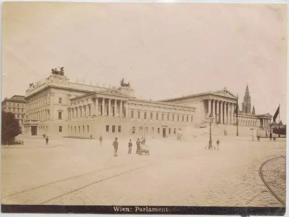 Bemerkungen: Frühe Aufnahme. Das Parlamentsgebäude an der Wiener Ringstraße, in dem die beiden Kammern des österreichischen Parlaments tagen, wird umgangssprachlich auch als `das Parlament` bezeichnet. Es wurde von 1874 bis 1883 nach einem Entwurf von Theophil von Hansen im neoklassizistischen Stil errichtet. Der Pallas-Athene-Brunnen wurde erst 1902 eingeweiht, auch die vier Rossbändiger von Josef Lax fehlen noch.