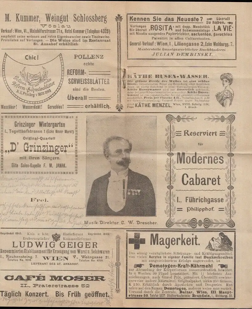 Bemerkungen: Enthält zahlreiche Anzeigen: Wie z. B. von Carl Gessl`s Restaurant `St. Annahof` wo tägliche Konzerte von Drescher oder der Kapelle des Inf.-Reg. Nr. 84, oder anderer Militärkapellen angekündigt werden. Aber auch Eugen Pallamaris Gummispezialitäten, Fisch von Hofmann & Engelhardt, oder Installatioon elektrischer Beleuchtung, Telegraphen, Telephone und Blitzableiter. Alle Anbieter sind aus Wien.