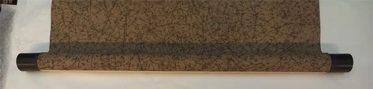 Japan. Antique hanging paper scroll. Heigth 69.8". Width 16.0" (ca. 177 x 40,6 cm). Wooden roller ends. Some minor tears in the upper part.