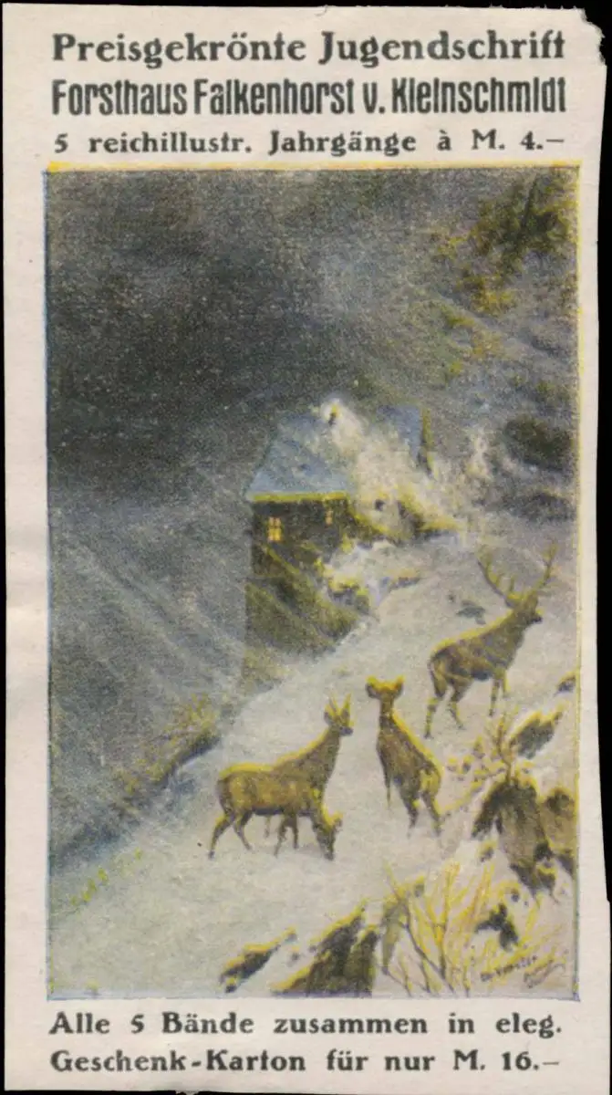 Forsthaus Falkenhorst v. Kleinschmidt, Preisgekrönte Jugendschrift, Jagd, Größe/Zustand: 8x4 , beschädigt, Original alte Reklamemarke die seinerzeit für die Werbung benutzt wurde