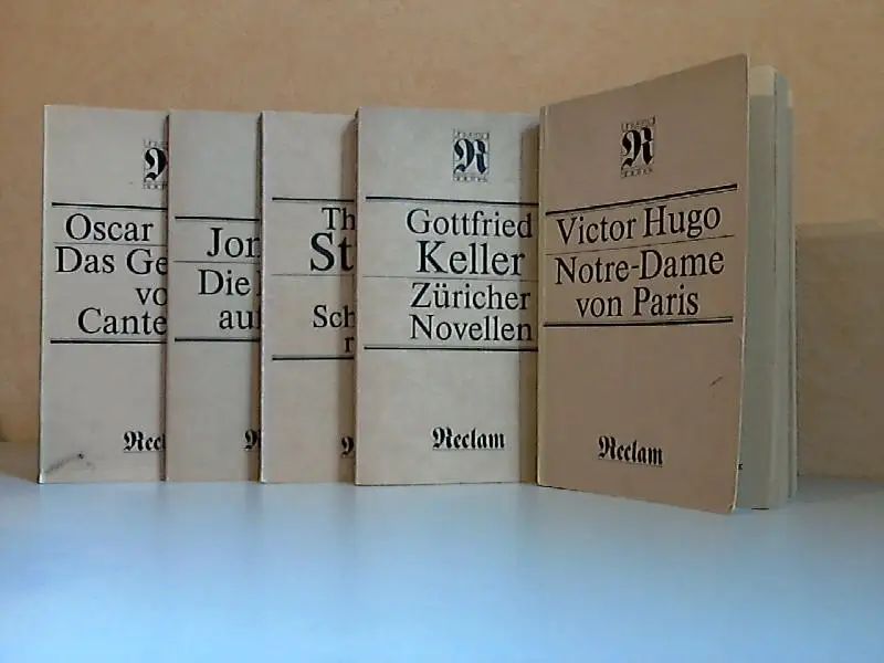 die Seiten und der Einband sind altersbedingt gebräunt, fleckig, DAS GESPENST VON CANTERVILLE, Erzählungen und Märchen von Oscar Wilde, Reclams Universal-Bibliothek Band 367, 5. Auflage: Das Gespenst von Cantervilte - Lord Arthur Saviles Verbrechen - Die Sphinx ohne Geheimnis - Der glückliche Prinz - Die Nachtigall und die Rose - Der eigensüchtige Riese - Der ergebene Freund - Die bedeutende Rakete - Der junge König - Der Geburtstag der Infantin - Das Sternenkind - Nachwort. DIE FAMILIE AUF GILJE von Jonas Lie, Reclams Universal-Bibliothek Band 1058, 3., veränderte Auflage: Mit „Die Familie auf Gilje" (1883) beginnt Lie eine Reihe von Gesellschaftsromanen, in denen er sich - ohne daß die Schärfe seiner Kritik mit der Ibsens oder Strindbergs vergleichbar wäre - mit dem Zerbrechen der traditionellen Familienbeziehungen und der Stellung der Frau in der bürgerlichen Gesellschaft auseinandersetzt: ..... DER SCHIMMELREITER von Theodor Storm, Reclams Universal-Bibliothek Band 171, 28. Auflage: Mit dem „Schimmelreiter" (1888) schuf Storm am Lebensende eine seiner schönsten Dichtungen. Der Deichgraf Hauke Haien, ein harter, willensstarker Mann, kämpft gegen Gleichgültigkeit, Dummheit und Neid, um die Deiche seiner friesischen Heimat zu bessern und zu mehren. ... ZÜRICHER NOVELLEN erster und zweiter Band von Gottfried Keller, Reclams Universal-Bibliothek Band 971: Hadlaub - Der Narr auf Manegg - Der Landvogt von Greifensee - Das Fähnlein der sieben Aufrechten - Ursula. NOTRE-DAME VON PARIS von Victor Hugo, Reclams Universal-Bibliothek Band 137: ... Für „Notre-Dame von Paris" sammelte der Autor drei Jahre lang Material, studierte er Chroniken und Geschichtsbücher. Es entstand ein in grellen Farben gehaltenes Bild vom mittelalterlichen Paris, das von Notre-Dame, der majestatischen gotischen Kathedrale, beherrscht wird Im Schatten dieses Bauwerks, „einer menschlichen Schöpfung, die reich und machtvoll ist wie die göttliche Schöpfung selbst, von der sie das Doppelantlitz ,Vielheit und Einheit* entlehnt zu haben scheint", entscheidet sich das Schicksal des Zigeunermädchens Esmeralda. ... Beschreibung vom Antiquariat Ardelt 3n2a Antiquariat Ardelt