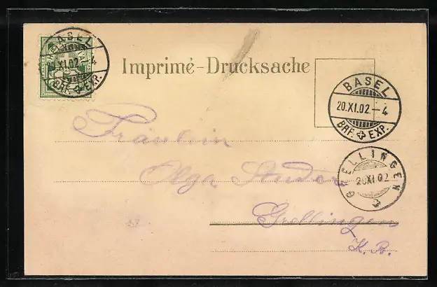 Personenbezogene Daten auf der Rückseite der Karte wurden durch blauen Textmarker unkenntlich gemacht. Die blauen Stellen sind auf die Vorderseite durchgeweicht und wirken sich negativ auf das Postkartenfoto aus