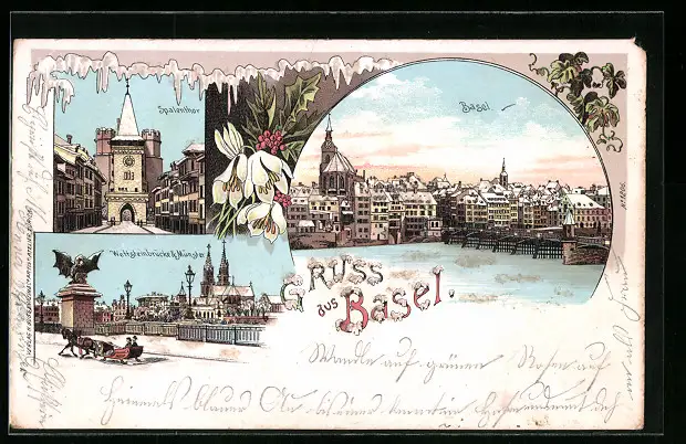 Winter-Lithographie Basel, Spalenthor, Wettsteinbrücke & Münster, Totalansicht