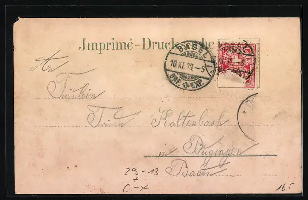 Personenbezogene Daten auf der Rückseite der Karte wurden durch blauen Textmarker unkenntlich gemacht. Die blauen Stellen sind auf die Vorderseite durchgeweicht und wirken sich negativ auf das Postkartenfoto aus