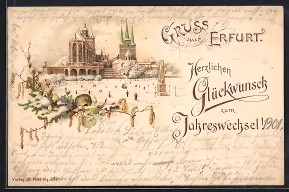 Winter-Lithographie Erfurt, Kirche und Denkmal in Schnee