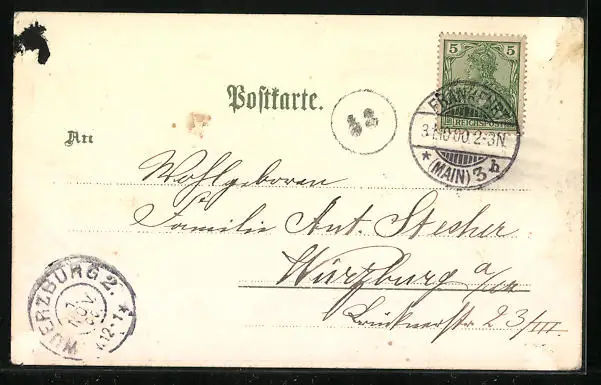 gelaufen 1900, rückseitig Klebe- und Papierreste, rückseitig Oberflächenschaden, guter Zustand