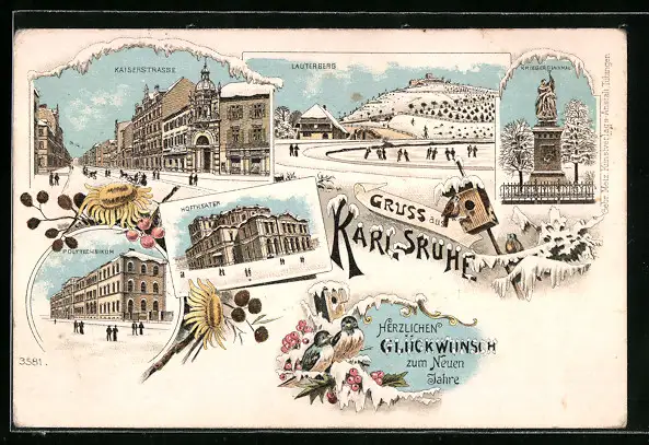Winter-Lithographie Karlsruhe, Kaiserstrasse, Hoftheater, Polytechnikum