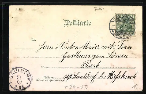 Personenbezogene Daten auf der Rückseite der Karte wurden durch blauen Textmarker unkenntlich gemacht. Die blauen Stellen sind auf die Vorderseite durchgeweicht und wirken sich negativ auf das Postkartenfoto aus