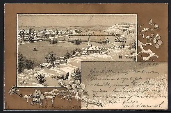 Winter-Lithographie Koblenz, Stadtansicht mit Flusspartie im Schnee