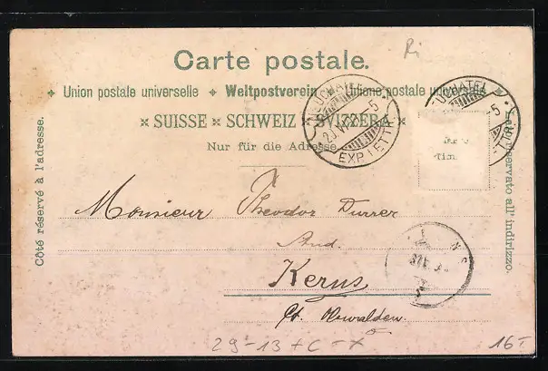 Personenbezogene Daten auf der Rückseite der Karte wurden durch blauen Textmarker unkenntlich gemacht. Die blauen Stellen sind auf die Vorderseite durchgeweicht und wirken sich negativ auf das Postkartenfoto aus