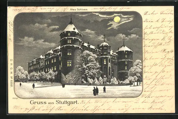 Winter-Lithographie Stuttgart, Altes Schloss bei Nacht