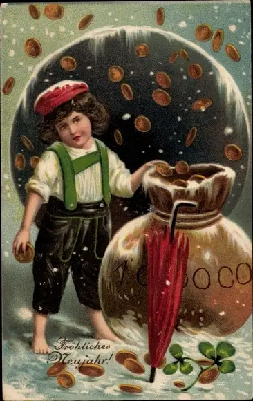 Winter Präge Litho Glückwunsch Neujahr, Kind, Geldregen, Kleeblätter