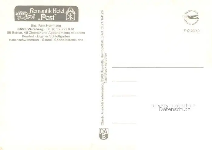 Wirsberg Romantik Hotel Post Wirsberg postalisch nicht gelaufen nach 1965 Erhaltung siehe scans [WerneD78] WernPID7