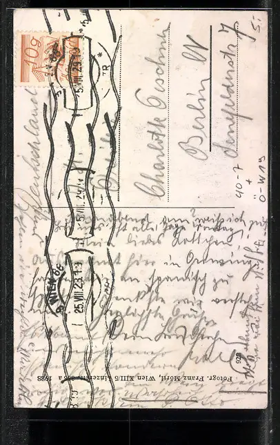 Personenbezogene Daten auf der Rückseite der Karte wurden durch blauen Textmarker unkenntlich gemacht. Die blauen Stellen sind auf die Vorderseite durchgeweicht und wirken sich negativ auf das Postkartenfoto aus