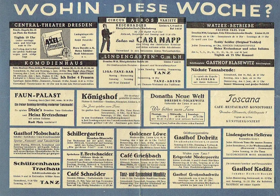 guter bis sehr guter Zustand, geringe Gebrauchs- und Alterungsspuren: mittig senkrecht und waagerecht gefalten, kleines Plakat für Veranstaltungen der Woche vom 30. Mai bis 5. Juni 1947: Theater, Kino, Zirkus Aeros, Tanz und Konzerte in Dresden, kartoniert, ca. 29,5 x 21, ein Blatt, beidseitig bedruckt