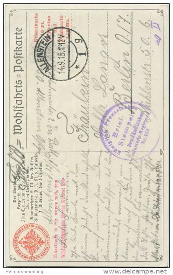 Wohlfahrts-Postkarte - Es braust ein Ruf wie Donnerhall - Verlag für Sozialpolitik Berlin - Feldpost (E14055) gel. 1915