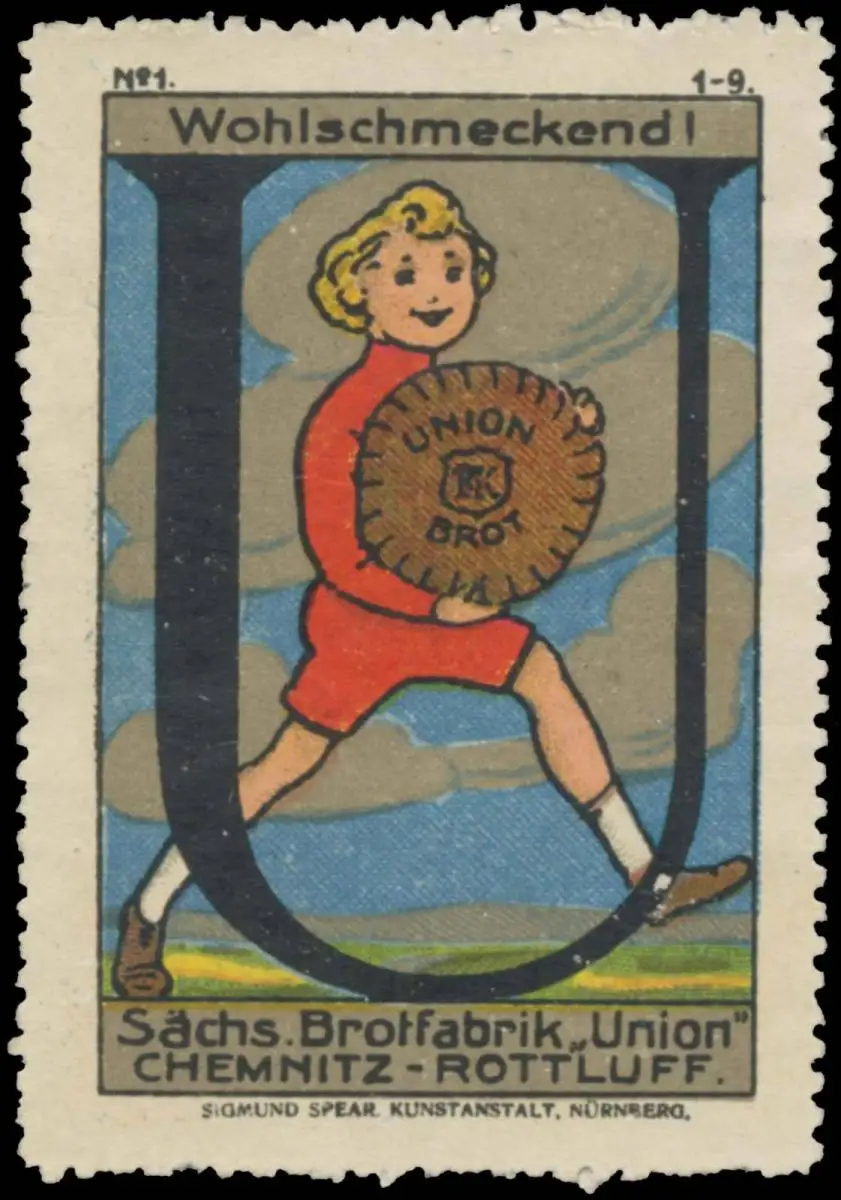 Buchstabe: U, No. 1, Bäcker, Druck: Sigmund Spear, Nürnberg, Größe/Zustand: 6x4 , guter Zustand, Original alte Reklamemarke die seinerzeit für die Werbung benutzt wurde