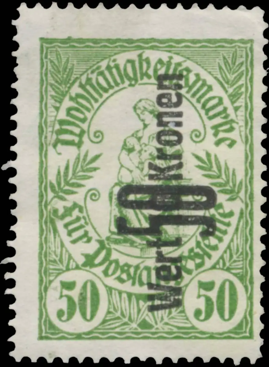 50, grün, Wert 50 Kronen, Post, Österreich, Spendenmarke, Größe/Zustand: 4x3 , guter Zustand, Original alte Reklamemarke die seinerzeit für die Werbung benutzt wurde