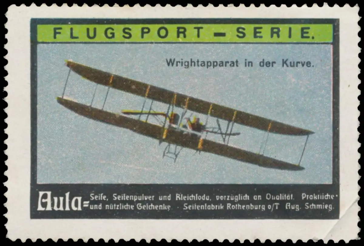 Flugsport-Serie, Flugmarke, Flugzeug Wright, , Aula Seife- und Seifenpulver, Größe/Zustand: 4x6 , leicht beschädigt, Original alte Reklamemarke die seinerzeit für die Werbung benutzt wurde