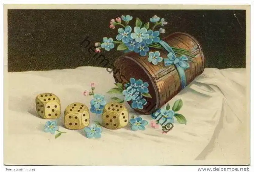 Würfel - Würfelbecher - Vergissmeinnicht - Eckknick oben rechts (E15186) gel. 1913