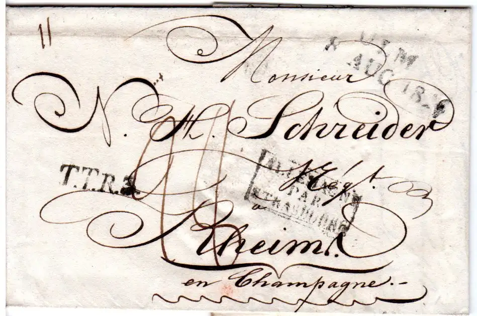 Faltbrief m. kpl. Inhalt via Thurn & Taxis u. Strassburg nach Rheims. Ank.Stpl. rückseitig.