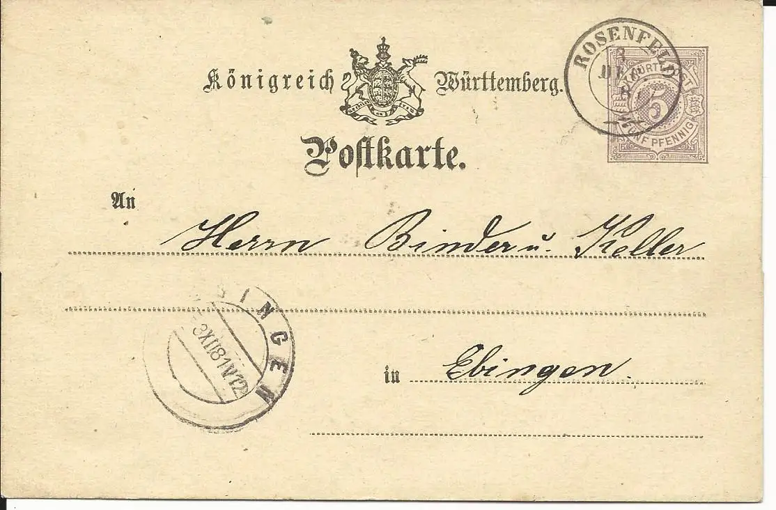 Württemberg 1881, K2 ROSENFELD klar auf 5 Pf. Ganzsache