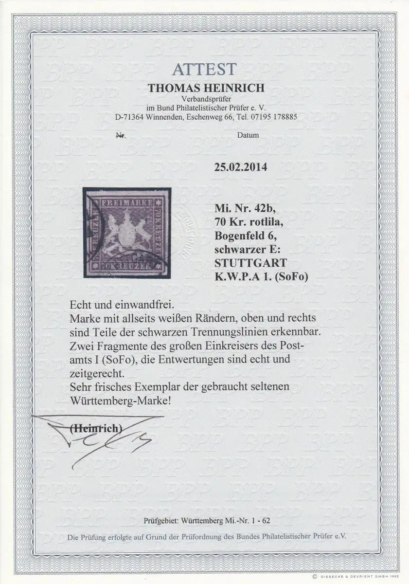 Württemberg: MiNr. 42b, Bogenfeld 6, gestempelt Stuttgart, BPP Attest