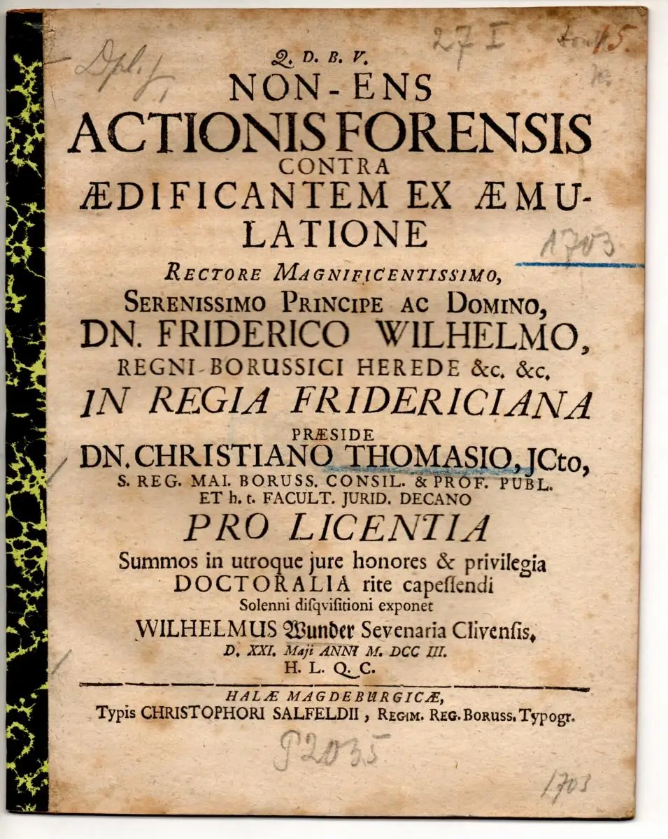 Wunder, Wilhelm: aus Sevenich, Kleve: Juristische Disputation. Non-ens actionis forensis contra aedificantem ex aemulatione.