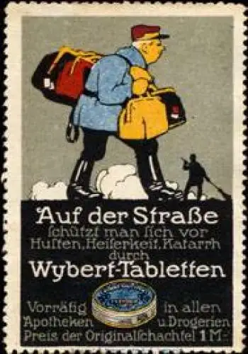 Auf der Straße schützt man sich vor Husten, Heiserkeit, Katarrh durch Wybert - Tabletten, Druckerei: Wezel & Naumann AG, Leipzig, Größe/Zustand: 6x4 , guter Zustand, Original alte Reklamemarke die seinerzeit für die Werbung benutzt wurde