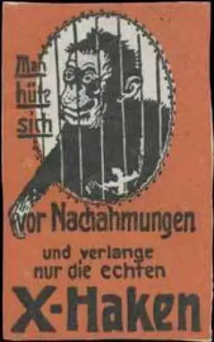 man hüte sich vor Nachahmungen und verlange nur die echten X-Haken, Affee, Größe/Zustand: 6x4 , beschnitten, Original alte Reklamemarke die seinerzeit für die Werbung benutzt wurde