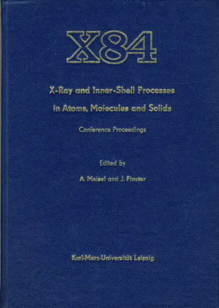 sehr guter Zustand, geringe Gebrauchs- und Alterungsspuren: kleine Notiz auf dem Titel, These Proceedings contain the invited papers of the International Conference on X-ray and Inner-Shell Processes in Atoms, Molecules and Solids - X 84, held at the Karl-Marx- Universität in Leipzig, GDR, August 20 - 24, 1984. X 84 followed the International Conferences on X-ray Spectroscopy (essentially a biennial series, started 1965 in Ithaca and Leipzig, then in Kiev, Paris, Munich, Helsinki and Washington) and on Inner-Shell Ionization Phenomena (1972 Atlanta, 1976 Freiburg), which were subsequently combined into one series upon the suggestion of IUPAP (1978 Sendai, 1980 Stirling, 1982 Eugene). The Conference was organized by Sektion Chemie of Karl-Marx-Universität in cooperation with the Physikalische Gesellschaft and the Chemische Gesellschaft der DDR, represented by the Conference Committee and the organizing Committee. An InternationalAdvisory Board was acting as consultant (the Committees are listed below). The five-day Conference was attended by 346 participants from 28 countries and West Berlin, representing almost all developed socialist and capitalist countries and also some developing countries. The 8 plenary and the 40 key-note speakers were invited to publish their texts in the X 84 Proceedings, and most of them have used this opportunity. Also the prescribed limit of 10 pages was obeyed by most authors. The material has been reproduced directly from the camera-ready manuscripts as provi- ded by the authors. The texts are arranged as follows: first all plenary papers, then all key-note papers of the parallel sessions A, grouped according to the Conference programme (essentially ion-atom collisions and inner-shell ionization phenomena), and then in the same way the key-note papers of the parallel sessions B (essentially X-ray and electron spectroscopies). Moreover, 219 posters (contributed papers) wore presented during the Conference; two-page abstracts of these have been published in a separate X 84 Book of Abstracts. The interesting new results and the high quality of almost all Conference papers ... - Forward electron production in heavy ion-atom and ion-solid collisions I. A. Sellin - Solid State and Nuclear Atomic Effects in Inner-Shell Processes - Mechanisms of ion induced secondary electron emission from solid surfaces H. J. Frischkorn, P. Koschart J. Kemmler, R. Latz, D. Hofmann, 3. Schader, E. Rohrbach and K. O. Groeneveld - Gamma-ray internal conversion in basic and applied research O. Dragoun - Resonance Phenomena - Resonance effects in photoelectron spectra I. Linden - The effect of giant resonances on the emission spectra of rare earth elements T. M. Zimkina, A.S. Shulakov, V. A. Fomichev, A.P. Braiko and A. P. Stepanov - Inelastic X-ray scattering including resonance phenomena J. Tulkki - Chemical Effects in Inner-Shell Ionization - Fine structure and chemical shifts in particle induced X-ray emission spectroscopy M. A. Blokhin, S. M. Blokhin, A. A. Polyakov and S. A. Prosandeev - The influence of chemical surroundings on inneratomic properties E. Hartmann - Valence electron rearrangement prior to X-ray or Auger electron emission M. Uda, A. Koyana, K. Maeda and I. Sasa - Key-note Papers B - X-Ray Emission Spectroscopy - New results and developments in X-ray emission spectroscopy C. Bonnelle - X-ray spectroscopy and quantum-chemical investigation of electronic structure of molecules L. N. Mazalov - Polarized X-ray emission spectroscopy G. Dräger and O. Brümmer - X-ray emission spectra and „structural aspects of disordered and amorphous materials G. Wiech and E. Z. Kurmaev - Electronic Structure Studies - d-s,p and f-p resonances in compounds and solid solutions E. P. Domashevskaya and V. A. Terekhov - Core electron spectroscopy of mixed valence materials O. K. Wertheim - Electronic structure spectroscopy of alloys and metallic hydrides D. J. Fabian - X-ray emission versus photoelectron spectra F. Werfel - X-Ray Absorption Spectroscopy and Related Methods - One-electron interpret ion of KANES and local structure determination: The case of rare earth compounds A. Bianconi, A. Marcelli, I. Davoli and S. Stizza - Progress in the bremsstrahlung isochromat spectroscopy and some examples of its applications J. Auleytner and J. Polka - u. a, Kunstleder, 526 Seiten