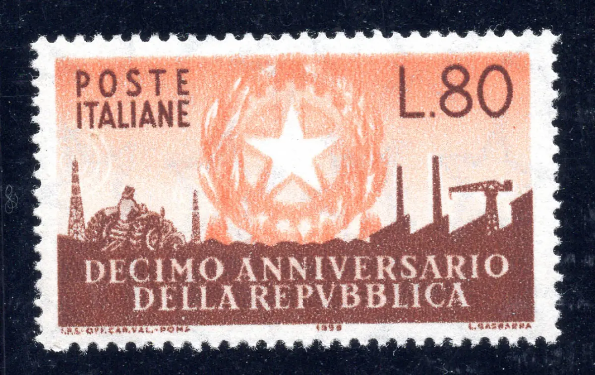 X.ann. Repubblica Lire 80 Sorten verwirrter Druck ** MNH - X. Ann. Repubblica Lire 80 Nr. 801 schönes Exemplar mit besonders auffälligem Verwirrungsdruck auf dem Wappen der Republik Nr. 801. 728/20