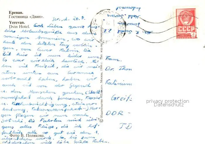 Yerevan Dvin Hotel Yerevan postalisch gelaufen nach 1965 Erhaltung siehe scans [FriedD77] Frierer