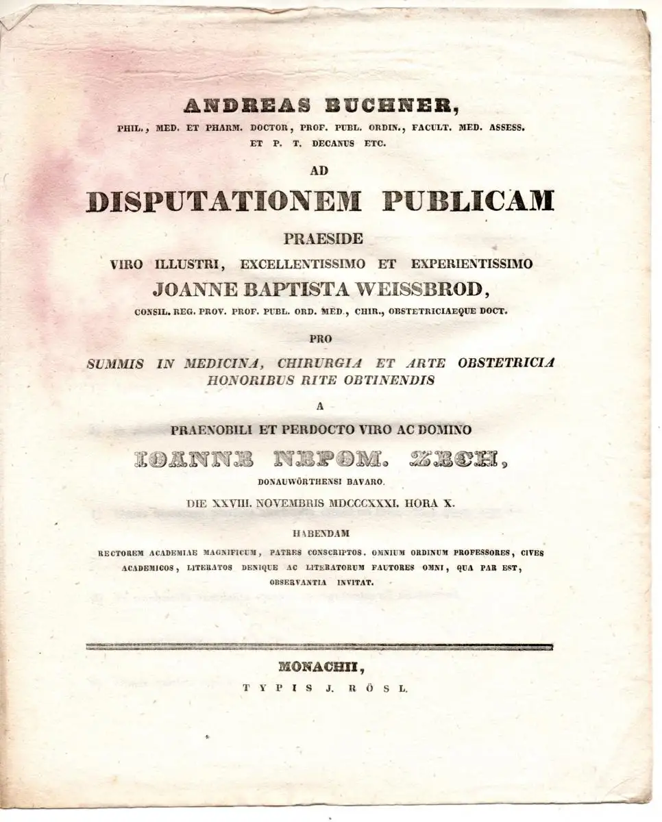 Präses: Johann Baptist Weissbrod; Disputatio: 11831-11-28; 2 Bl., 25 cm, Ränder geknickt, Ecke rotfleckig.