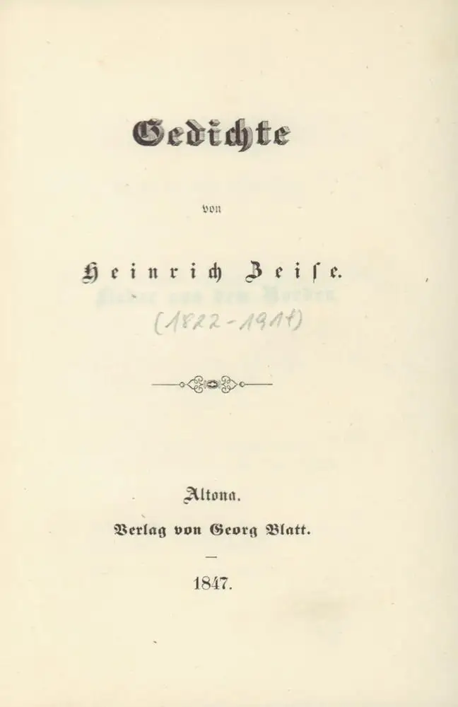 H. Zeise (1822-1914), Apotheker u. Schriftsteller, Übersetzer der Werke von Hans Christian Andersen u.a. skandinavischer Dichter, von heute vergessener lokaler Bedeutung. Zu Lebzeiten geschätzt wegen seiner Kampflieder (Befreiung Schleswig-Holsteins) u. Landschaftslyrik. - Rücken verblaßt, vereinzelt stockfl