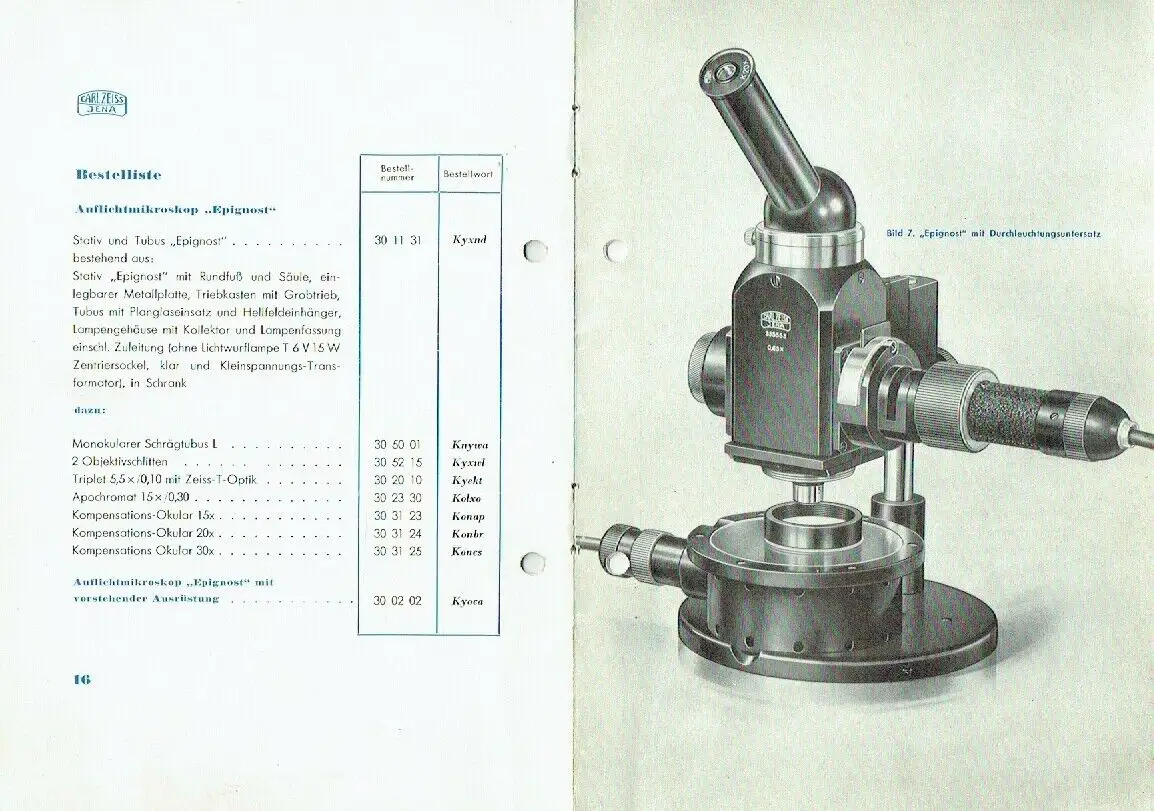 guter Zustand, Gebrauchs- und Alterungsspuren: Umschlag mit kleinen Blessuren - Rückseite leicht verschmutzt - gelocht - Deckel links unten von innen geklebt - Seiten teils etwas eselsohrig - Seiten sauber und ordentlich, Prospekt für das Auflichtmikroskop mit Aufbau und Wirkungsweise, Strahlengang, Beschreibung, Bedienungsanleitung, Ergänzungseinrichtungen, Bestellliste, Fertigungsprogramm der Firma, Softcover, ca. 15 x 21, 20 Seiten mit 8 Bildern