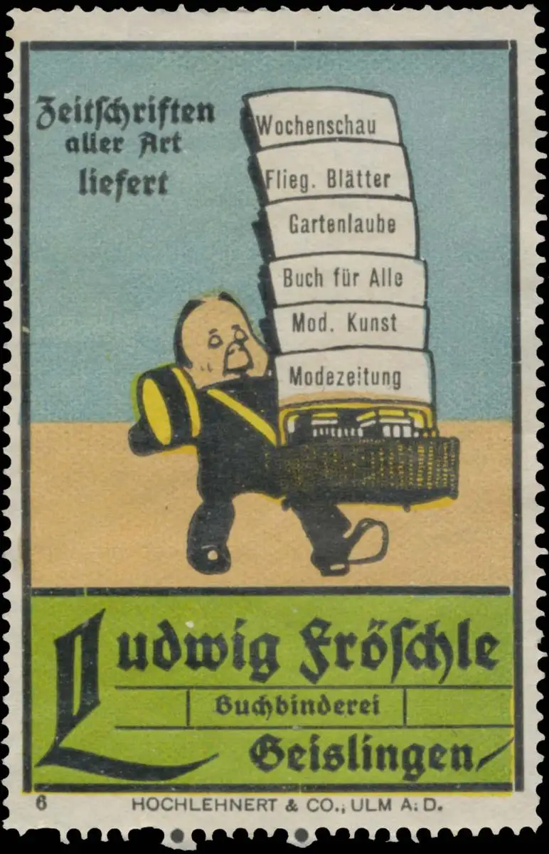 Buchbinderei, Druck: Hochlehnert & Co. Ulm, Nr. 6, Größe/Zustand: 7x5 , guter Zustand, Original alte Reklamemarke die seinerzeit für die Werbung benutzt wurde