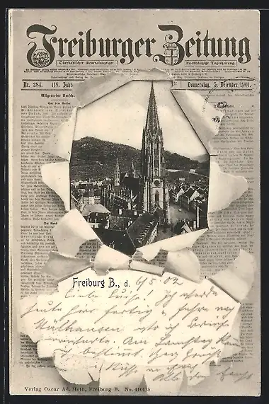 Zeitung-AK Freiburg / Breisgau, Dom in zerrissener Freiburger Zeitung
