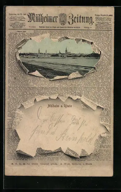 Zeitung-AK Mülheim a. Rhein, Ortsansicht mit Zeitung