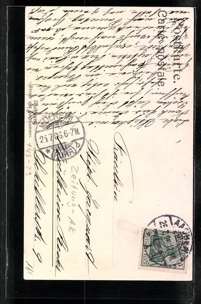Personenbezogene Daten auf der Rückseite der Karte wurden durch blauen Textmarker unkenntlich gemacht. Die blauen Stellen sind auf die Vorderseite durchgeweicht und wirken sich negativ auf das Postkartenfoto aus