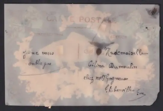 Personenbezogene Daten auf der Rückseite der Karte wurden durch blauen Textmarker unkenntlich gemacht. Die blauen Stellen sind auf die Vorderseite durchgeweicht und wirken sich negativ auf das Postkartenfoto aus