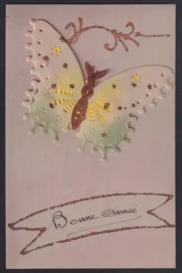 Zelluloid-AK Bonne Année, Neujahrsgruss mit Schmetterling