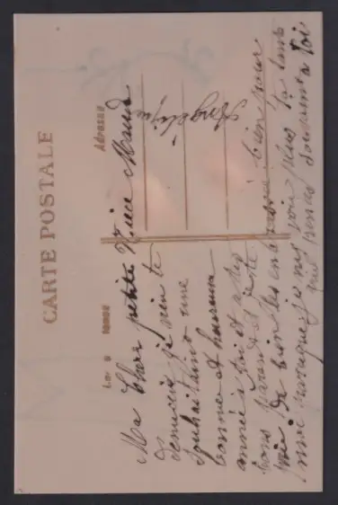 Personenbezogene Daten auf der Rückseite der Karte wurden durch blauen Textmarker unkenntlich gemacht. Die blauen Stellen sind auf die Vorderseite durchgeweicht und wirken sich negativ auf das Postkartenfoto aus