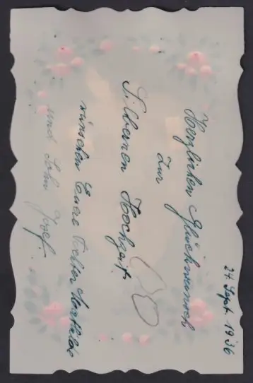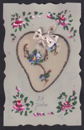 Zelluloid-AK Herz mit rosa Schleife und Blumen