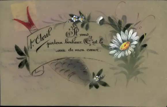 Zelluloid Ak 1. April, Weiße Blume, Fisch