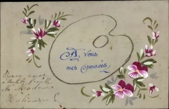 Zelluloid Ak A vous mes pensées, Malerpalette, Blumen